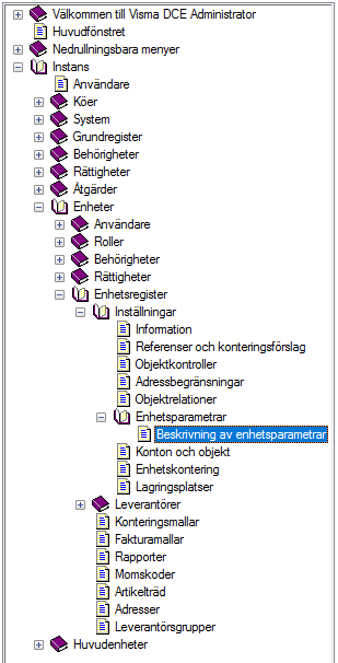 För att hitta avsnittet om enhetsparametrar navigerar du i trädmenyn enligt bilden nedan. Du kan där läsa om vad parametrarna gör och vilka inställningar det finns för respektive parameter.