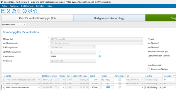 Om du senare behöver redigera verifikationen, är tipset att kontrollera fälten Ägartyp och Skapad av för den tillagda raden. I fältet Ägartyp ska Periodisering finnas och i fältet Skapad av ska aktuellt PeriodiseringsID finnas. Det gäller både för raden med kostnadskonto och för raden med periodiseringskonto.