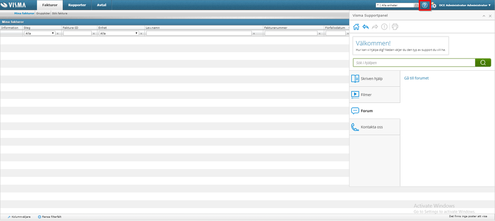 Du enkelt ta dig till vårt community via Visma DCE och ta del av alla de foruminlägg och tips som vi skriver här. När du är inne i Visma DCE kan du klicka på frågetecknet uppe till höger och den rutan som öppnas heter Visma Supportpanel. Förutom att du här kan hitta den skrivna hjälpen för Visma DCE och våra hjälpfilmer så kan du ta dig direkt till vår community.