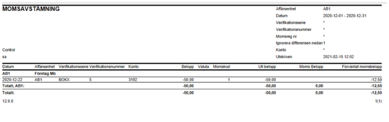 I rapporten listas transaktioner med momskod, där det bokförda momsbeloppet inte stämmer mot använd momskod och belopp som momsen har beräknats från.