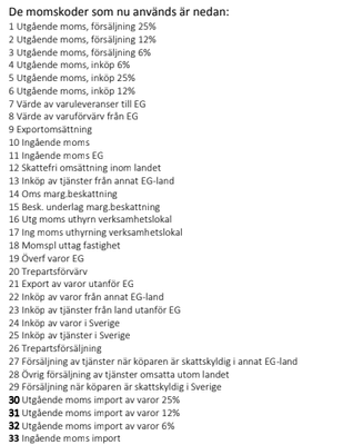 En förutsättning för att momsavstämningen ska fungera är att momskoderna har satts upp enligt standarduppsättningen och är kopplade till aktuella konton. Här ser du en lista över momskoder: