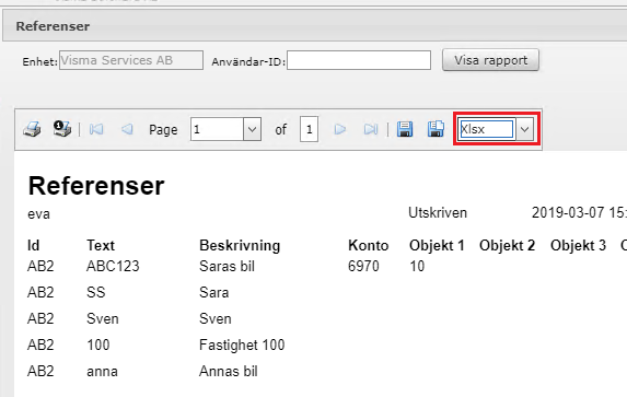 Om du vill ha ut en lista på alla era referenser till Excel så finns det en rapport för detta i DCE som heter Referenser. Denna skrivs ut per enhet. I övre delen väljer du xslx om du vill spara den i Excel-format.