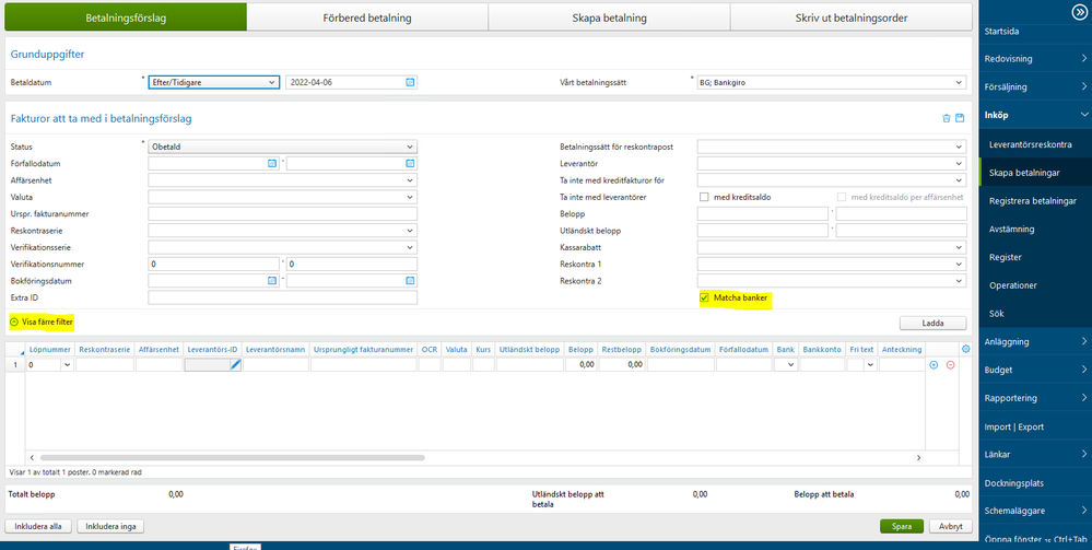 För att åtgärda detta går man till Inköp - Skapa betalningar, trycker på "Visa fler filter" på vänstersidan och markerar sedan "Matcha banker" på högersidan. Denna justering kan göras både under fliken "Betalningsförslag" och fliken "Förbered betalning". Efter att posterna har laddats om fylls kolumnen "Bank" automatiskt i och beloppet hamnar i kolumnen "Belopp".