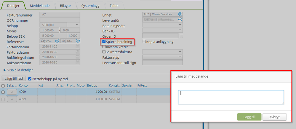 Från version 13 av DCE går det att styra om ett meddelande måste anges eller ej vid användning av funktionen "Spärra för betalning". Inställningen hittas i DCE-admin under enhetsparametrar och heter "BlockPaymentMessage". Parametern kan ha värde 1 och 0, där 1 anger att ett meddelande alltid måste anges om en faktura bockas i för "Spärra för betalning".