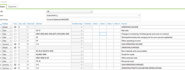 I ColRows kan du skapa egna rad- och kolumndefinitioner om du vill att din balans- eller resultaträkning ska se ut på annat sätt än det som är standard. Du kanske vill ha en resultaträkning med endast summor per kvartal eller en funktionsindelad resultaträkning? För att dölja en rad tar du bort markeringen i kryssrutan i kolumnen Visa i raddefinitionen.
