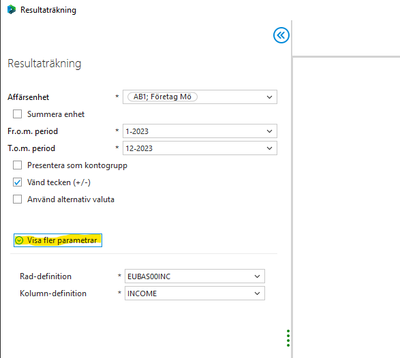 Tänk på att alla förändringar som görs i ColRows slår igenom i vissa av databasens tabeller. Om du vill utgå från en tidigare rapport som du ändrar, rekommenderar vi därför att du först sparar om definitionen med ett nytt namn, och därefter ändra i kopian. Namnet på nuvarande rad- och kolumndefinition kan du se under “Visa fler parametrar” på respektive rapport i Utskriftscentralen.