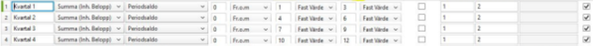 I kolumndefinitionen anges periodsaldo och 0 för innevarande år. Ange därefter fr o m månad och t o m månad, samt fast värde för kvartalen.
