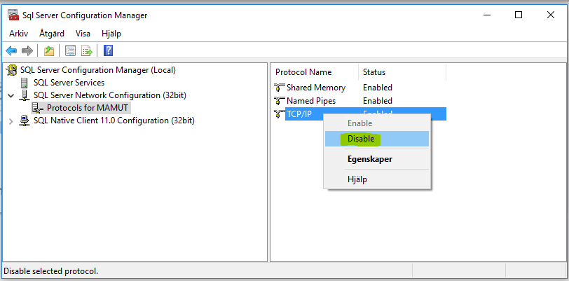 Om programmet bara ska användas på en dator kan man lösa problemet genom att ställa in SQL-servern till att inte använda nätverket.