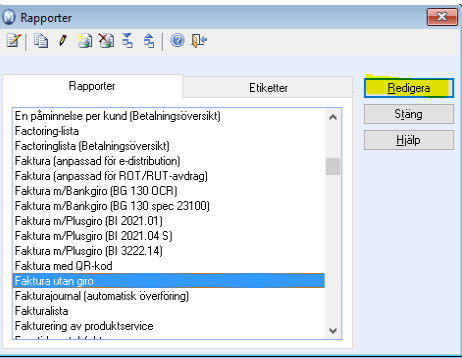 TIPS: Skriv först ut den rapport du önskar redigera. Det är då lättare att avgöra vilket fält i rapporten som motsvarar vilket fält i rapporteditorn