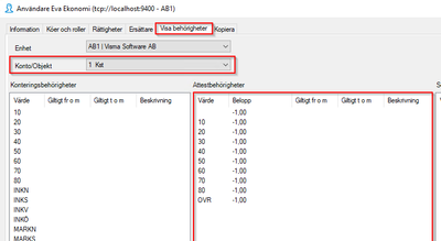 Saknas något värde från den anställda behöver detta läggas till via "Behörigheter>Behörigheter, fliken Attestbehörigheter". Vi rekommenderar här att nyttja roller men behörigheterna kan även läggas direkt på användaren.