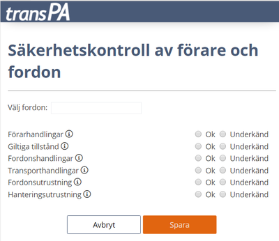 Det vanligaste är att kontrollen av förare/fordon genomförs när passet påbörjas eller avslutas och att kontrollen av släp genomförs varje gång man byter släp. Information om vad som förväntas av dig som förare får du från dina arbetsgivare. TransPA sparar information om när en säkerhetskontroll har genomförts och vilka kontrollpunkter som satts som OK eller underkänts.