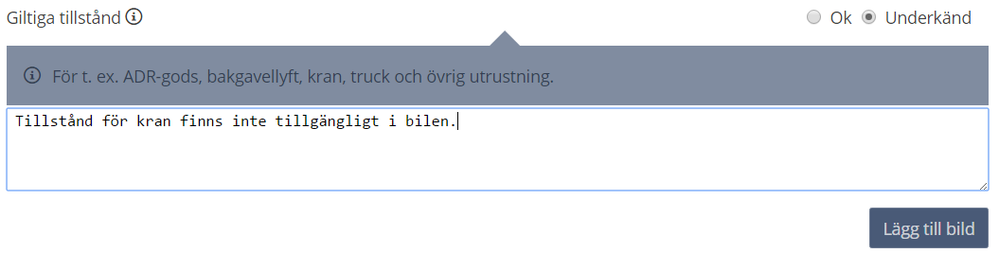 Börja med att ange vilket fordon du använder. Du kan skriva in både internnummer och registreringsnummer. TransPA föreslår alltid det senaste fordonet du använde. Gå sedan igenom varje kontrollpunkt och ange om den är OK eller underkänd. Om du vill få mer information om vad kontrollpunkten innebär klickar du på Info-knappen.