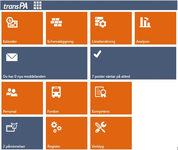På startmenyn ser du menyvalen med knappar, de med större gul text har levande information - nya meddelanden, antal poster som du har att attestera, samt antal påminnelser. Själva layouten styrs av dina användarrättigheter, med andra ord så har du de knappar som du har tillgång till och behöver i ditt arbete.