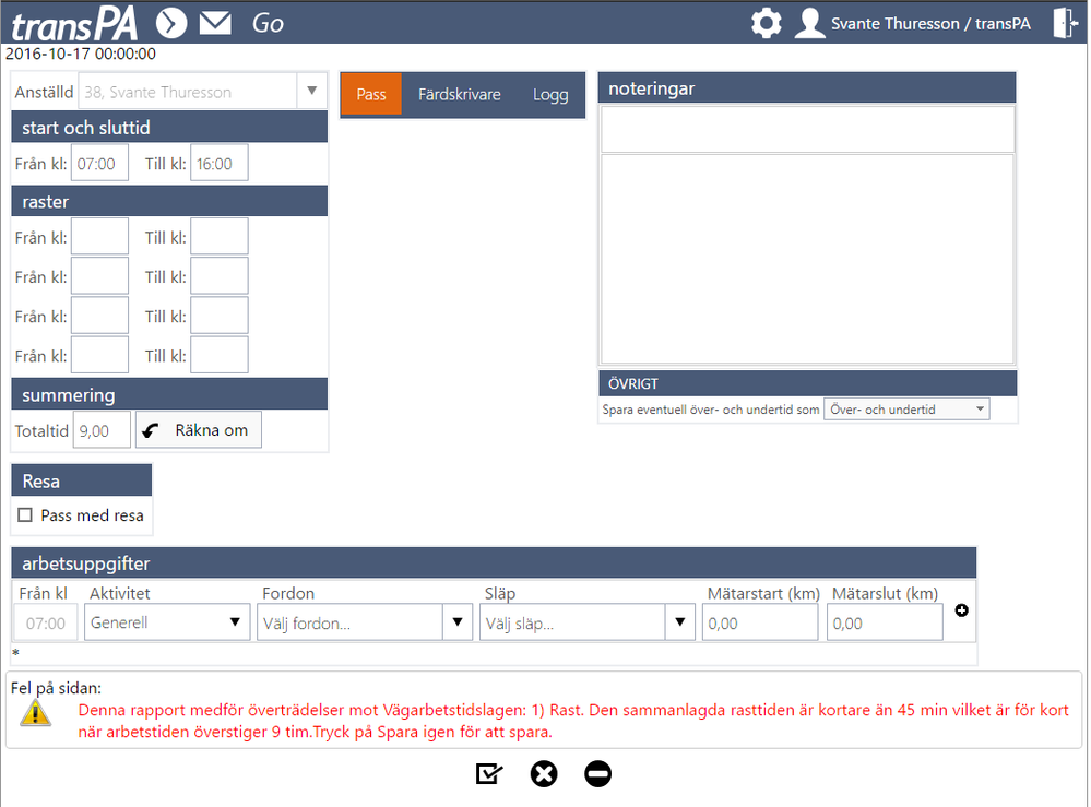 I samband med att tidrapport ska registreras utförs kontroll. Finns överträdelse syns information om orsak tillsammans med varning längst ned. Registrering kan ej göras så länge överträdelse finns.
