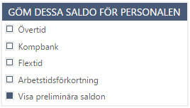Ni styr själva vad som visas i vyn för tidrapportering. Nedanstående inställning skulle ge personal som tidrapporterar full åtkomst till samtliga saldon, då vi valt att ej gömma varken övertid, komptid, flextid eller arbetstidsförkortning. Vi har dessutom valt att visa preliminära saldon.