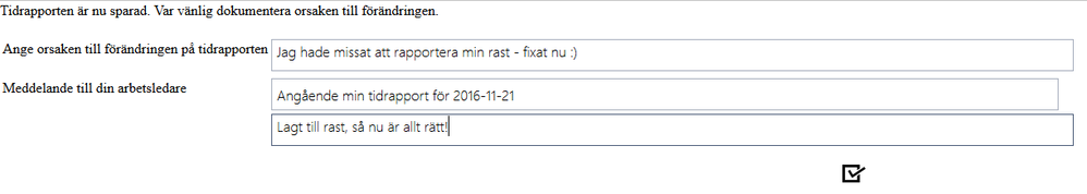 Här ställer ni in vilken återkoppling ni önskar då en tidrapport förändras. Ni kan ställa in kraven olika beroende på om arbetsledare eller personal gör förändring. Har ni valt Alltid eller Valfritt dyker denna ruta upp efter ändring av tidrapport: