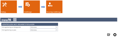 TransPA kan i samband med tidrapportering kontrollera om överträdelser sker mot vägarbetstidslagen. Här kan ni slå på funktionen och väljer då också hur den ska fungera.