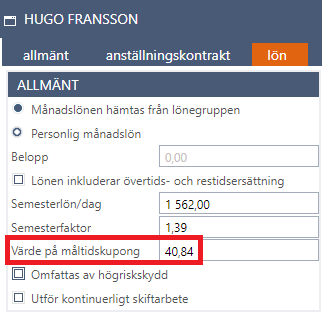 Om ni har anställda som är på resa och får ersättning för traktamente så känner inte programmet av att ersättning för måltidskuponger inte ska utgå. Vid dessa tillfällen behöver ni plocka bort måltidskuponger för de dagar som berörs. Ni justerar ner det totala antalet för löneperioden i löneberäkningen.