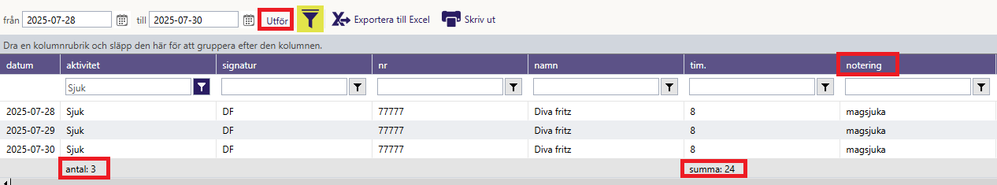 I exemplet nedan visas sjukfrånvaro eftersom vi har valt att filtrera på Sjuk. För att ladda rapporten, klicka på "Utför". När vi registrerade sjukfrånvaron i kalendern, skrev vi en kommentar i fältet "Notering", och den informationen visas nu under fältet Notering.