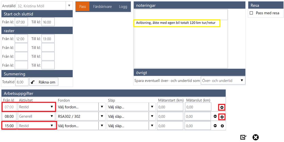 Registrera tidrapporten med start och sluttid samt rast. Restid registrerar ni som första och sista arbetsuppgift, likt nedan, då Kristina i exemplet kört egen bil från 07.00 till 08.00 och vid dagens slut från 15.00 till 16.00. Ni trycker på plustecknet för att skapa ny rad. Starttid för varje arbetsuppgift är det som krävs.