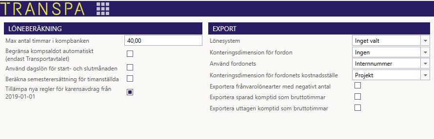 OBS: Du kan inte ha samma konteringsdimension för fordon som för fordonets kostnadsställe. Har du t ex resultatenhet för fordon får du välja något annat för kostnadsställe. Vi rekommenderar att du sedan testar med att exportera en lönefil från TransPA och importera i ditt lönesystem, för att se till att konteringsdimensionen matchar med det som är registrerat i löneprogrammet.