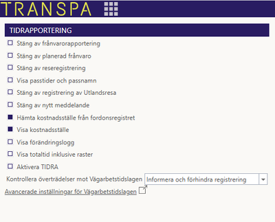 Numera finns även möjlighet att låta ett fordon ha olika kostnadsställen vid olika tillfällen, inte nödvändigtvis det som står i fordonsregistret. Till exempel kanske ett fordon lånas ut och ska tillfälligt belasta ett annat kostnadsställe, och vill man ha möjligheten att ha även den kostnadsfördelningen korrekt, så får man ändra en inställning i Transpa. Den hittar du under Verktyg - Inställningar - Tidrapportering.