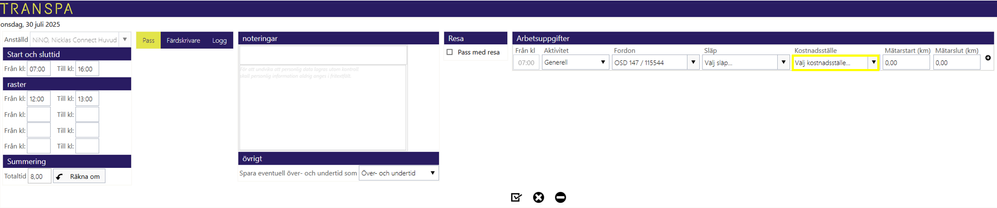Normalt är Hämta kostnadsställe från fordonsregistret markerad och Visa kostnadsställe inte markerad, så om du klickar i Visa kostnadsställe kommer en extra ruta dyka upp på alla ställen i Transpa där du väljer fordon (se nedan). Det vill säga, för alla pass, tidrapporter, frånvaro, för både förare och administratörer, finns det nu möjlighet att ändra kostnadsställe från det som föreslås från fordonsregistret. Här är man antingen välja ett annat kostnadsställe från en lista, eller om man redan vet vad det är, skriva det direkt, innan man sparar. Vill man se effekten av kostnadsfördelningen mellan de olika kostnadsställena ser man det lättast genom att visa rapporten Tidstransaktioner.