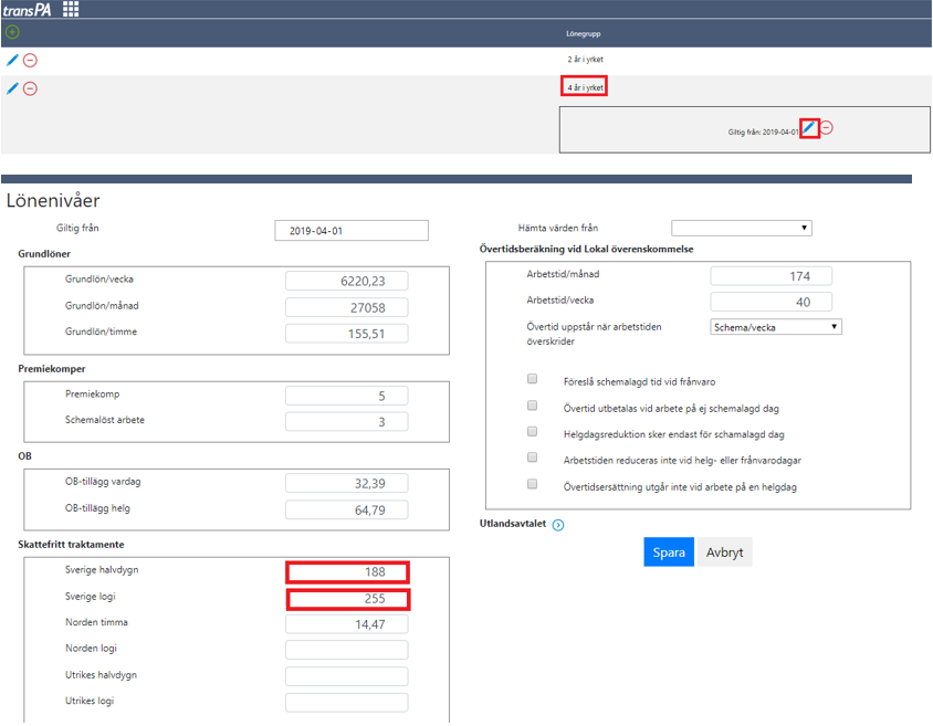 I exemplet har vi 6 år i yrket Klicka på "pennan" till vänster om lönegruppens namn så öppnas ett nytt fönster, klicka på "pennan" bredvid Giltig från 2022-04-01 för att ta fram hur lönegruppen ser ut. Under traktamente syns beloppen.