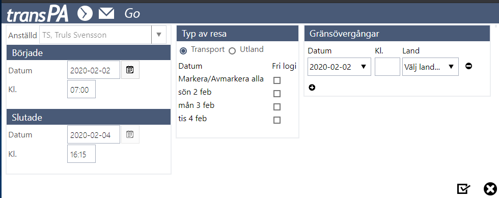 För att få TransPA till att räkna traktamente åt er så krävs att ni rapporterar en aktivitet av typen resa. Reseberäkningen är helt skiljd från arbetstiden. Arbetspasset rapporteras först dag för dag och resan registreras separat som en aktivitet först efter hemkomst.