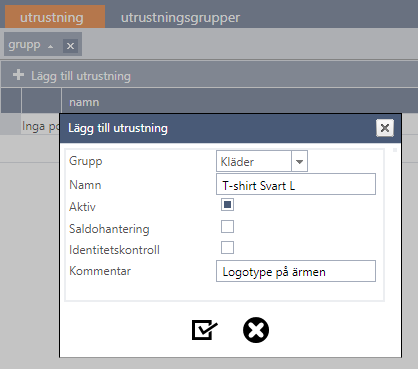 När du skapar ditt utrustningsregister får du fundera över vilken av typ av utrustning du vill ha. Den enklaste typen behöver du bara ange namn på artikeln, välja utrustningsgrupp och eventuellt om du behöver skriva en kommentar. Artikeln går sedan att placera på den anställde, och ingen ytterligare kontroll sker.