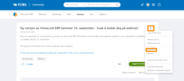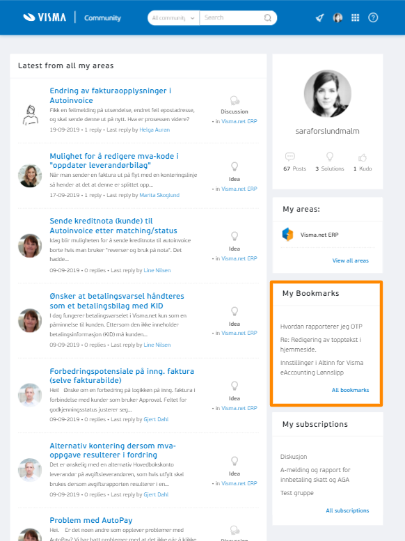 Dine bokmerker finner du på din startside, i menyen til høyre. Du finner startsiden ved å trykke på Community i top-menyen.