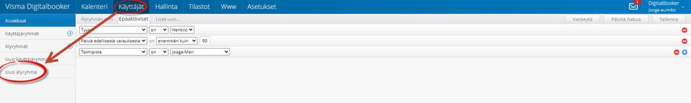 Käyttäjät-valikon alta löytyy Uusi älyryhmä-valikko. Voit täältä luoda uuden älyryhmän, eli ryhmän joka täyttyy automaattisesti asiakkaista jotka täyttävät tietyt kriteerit. Esimerkissämme olemme halunneet tavoittaa asiakkaat, jotka ovat olleet 90 päivää ilman uusia varauksia tietyssä toimipisteessä.
