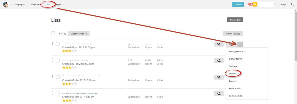 Voit tuoda asiakkaita joko olemassa olevaan listaan tai luoda kokonaan uuden listan (Create list). Olemassaolevaan listaan voit lisätä asiakkaita kohdasta Lists -> Import.
