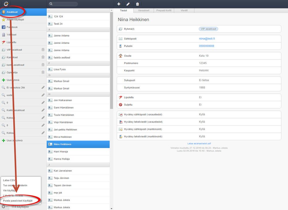 Ominaisuus auttaa sinua tilanteessa, jossa asiakas pyytää saada nähdä järjestelmään tallennetut omat henkilötietonsa. Menet asiakkaan kortille, ja painat Lataa asiakastiedot.pdf.