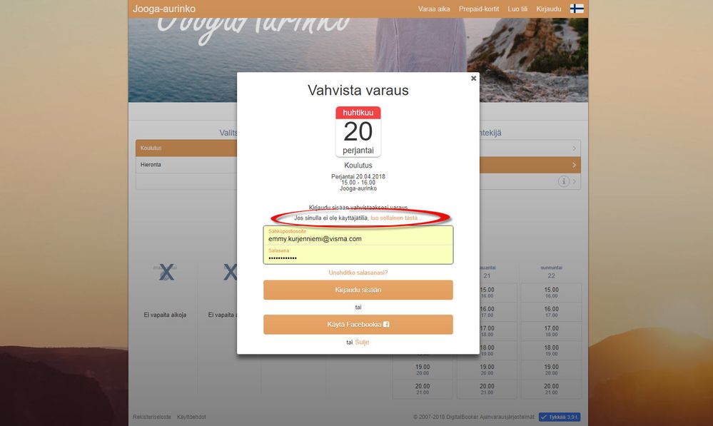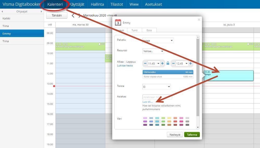 1) Asiakas voi itse tehdä rekisteröinnin julkipuolella klikkaamalla vapaata aikaa