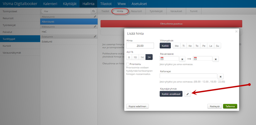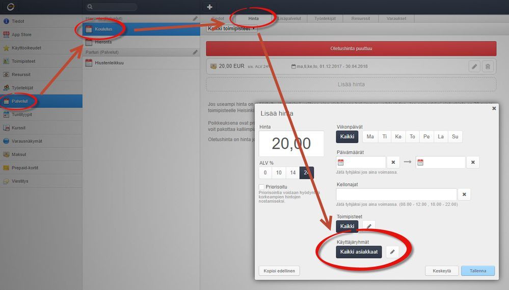 Mene sitten kohtaan Hallinta -> Palvelut -> Valitse palvelu -> Hinta -> Lisää hinta. Määrittele hinta ja muut tiedot haluamallasi tavalla ja valitse sitten käyttäjäryhmästä oikea ryhmä. Tämä hinta tarjotaan asiakkaalle kun hän on kirjautunut ja kuuluu kyseiseen käyttäjäryhmään. Käyttäjän voi lisätä ryhmään käyttäjän tiedoissa asiakasrekisterissä.