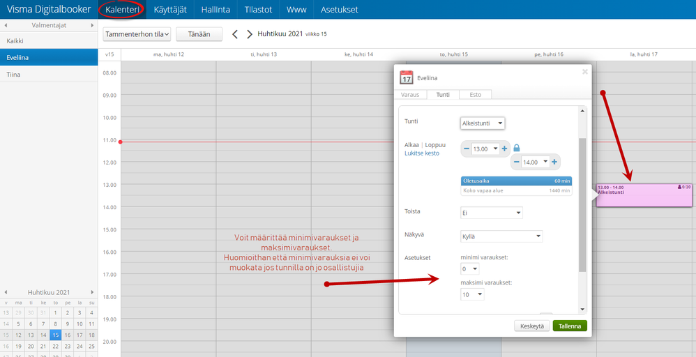 Muista määritellä palvelut, linkitä niihin työntekijät (ja mahdolliset resurssit) ja anna työntekijöille työajat. Tarkista myös, että kalenteriin on varmasti luotu jotain varattavaa. Klikkaa vasemmassa Kalenteri. Luo sitten varattava asia ja tallenna.
