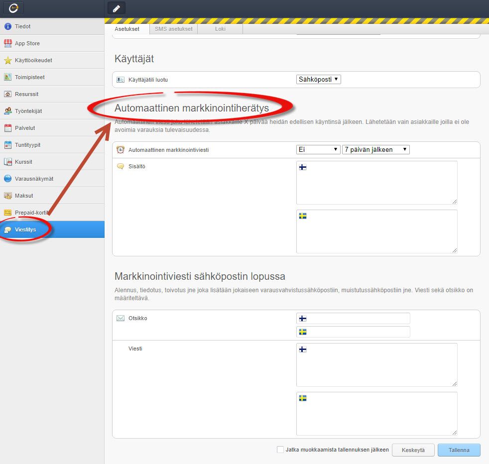 Automaattinen markkinointiviesti löytyy kohdassa > Asetukset > Viestitys. Viestitoiminto pitää olla aktivoituna sillä hetkellä kun asiakas luo varauksen. Automaattinen markkinointiviesti on tekstiviestimuistutus, jonka järjestelmä lähettää asiakkaalle automaattisesti, kun viimeisestä käynnistä on kulunut määrittelemäsi aika. Viestin sisällön voit määritellä itse.