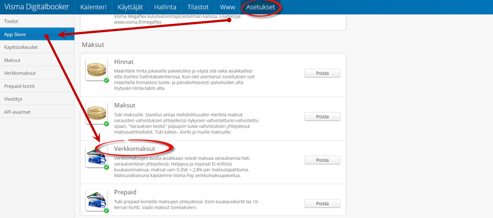 Katso vielä Hallinta > toimipisteet, että toimipisteellä on verkkomaksut päällä.