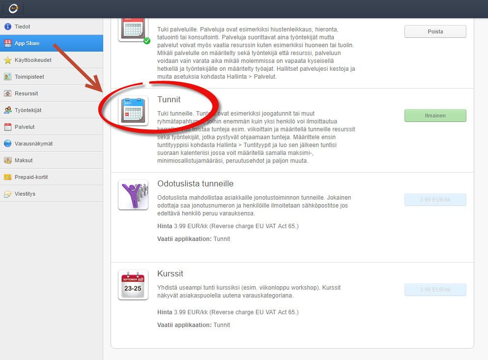Jos et löydä tuntityyppejä kalenteristasi, mene Asetukset > App Store ja ota ilmainen Tunnit-sovellus käyttöön: