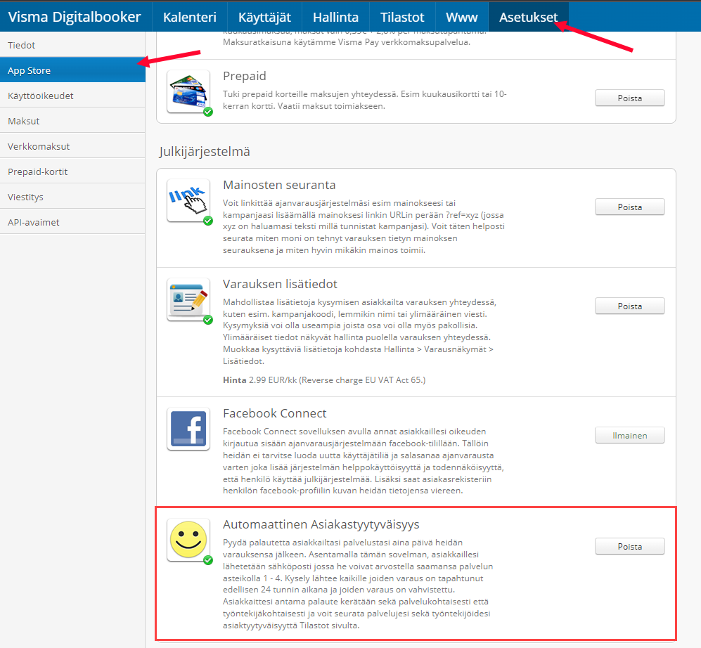 “Automaattinen asiakastyytyväisyys” -lisäosa voidaan ottaa käyttöön DigitalBookerin asetuksista (Asetukset > AppStore). Lisäosa on maksuton.