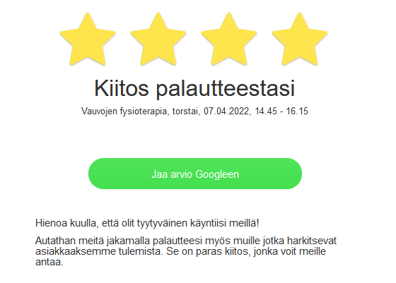 Uutena ominaisuutena on nyt mahdollista pyytää asiakkailta palautetta, joka näkyy yrityksesi Google arvosteluissa. Toimipisteen tietoihin voidaan lisätä toimipisteen Googlen Place ID -tunniste. Näin asiakkaalle lähtevään tyytyväisyyskyselyyn saadaan linkki Googlen arvostelu-palveluun. Asiakkaan tulee siis vielä erikseen käydä lisäämässä palaute Googlen arvostelu-palveluun
