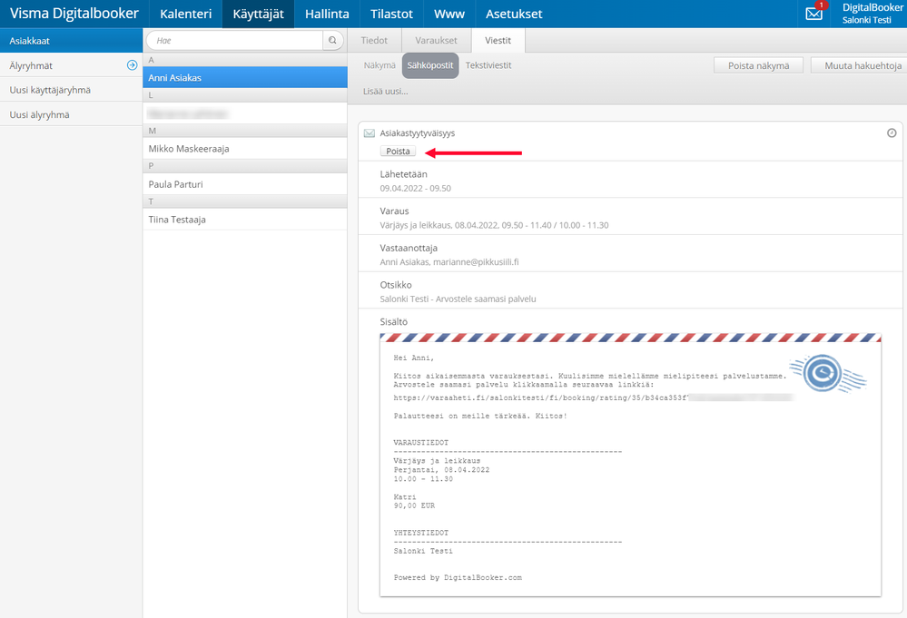 Halutessaan tiettyä palvelua koskevan, automaattisesti lähtevän kysely-viestin voi myös poistaa, ennen kuin se on lähetetty. Tämä onnistuu Käyttäjät-sivulta, asiakkaan tiedoista Viestit -välilehdeltä.