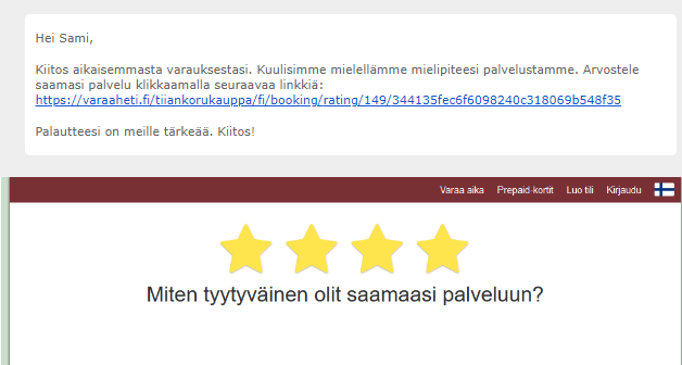 Asiakas voi arvostella saamansa palvelun asteikoilla 1-4 ja lähettää myös kirjallisen palautteen palvelusta sähköpostitse. Huom! Kysely lähtee vain asiakkaille, jotka ovat luoneet käyttäjätilin ja hyväksyneet sähköpostitse lähetettävät markkinointiviestit.