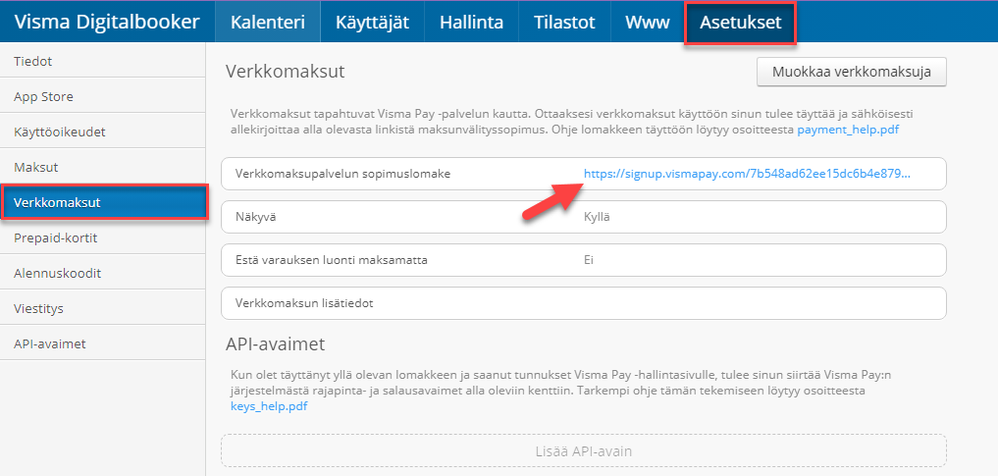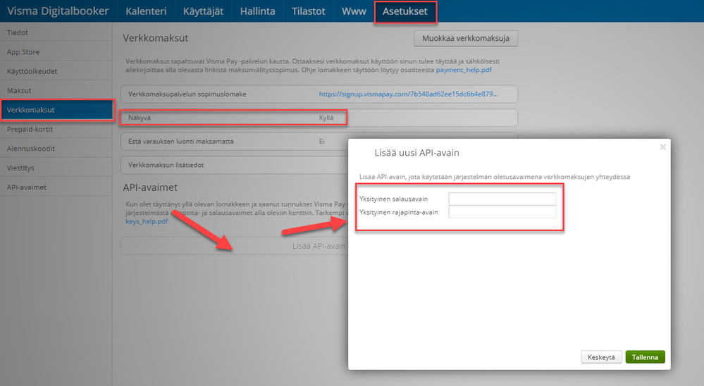 3. Syötä avaimet Digitalbookeriin Kohtaan Asetukset -> Verkkomaksut -> API-avaimet.