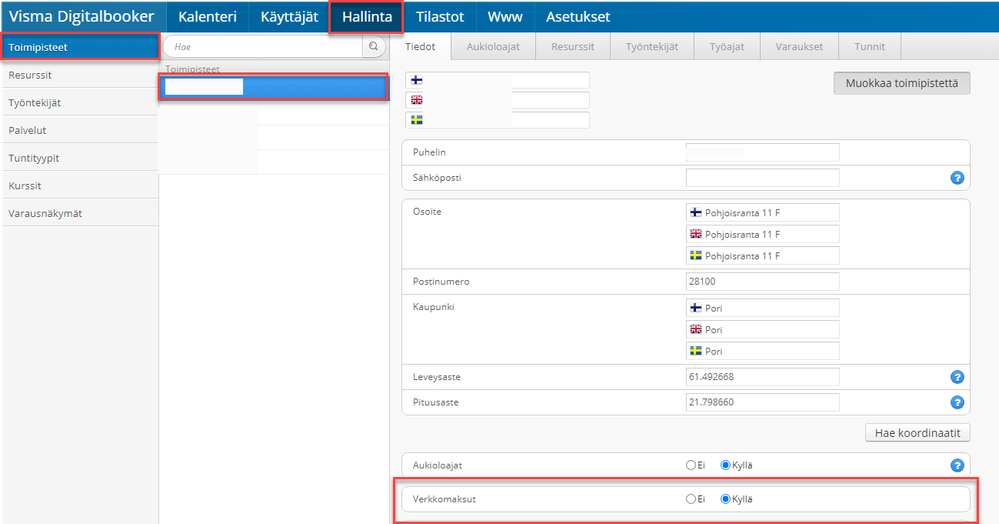Katso vielä Hallinta > toimipisteet, että toimipisteellä on verkkomaksut päällä.