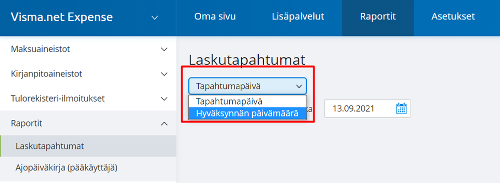Nyt voit rajata Laskutapahtumat (csv) niin tapahtumapäivän kuin hyväksyntäpäivän perusteella.