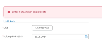 Kun yrittää tallentaa tätä kulua, niin käyttäjä saa virheilmoituksen liitteen puuttumisesta.