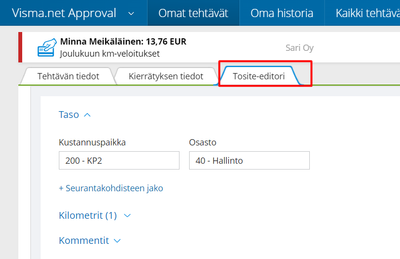 Julkaisun jälkeen muokkaus tapahtuu omalla välilehdellä (Tosite-editori), jossa näytetään myös kommentit. Uusi välilehti näkyy Tehtävän ja Kierrätyksen tiedot- välilehtien yhteydessä.