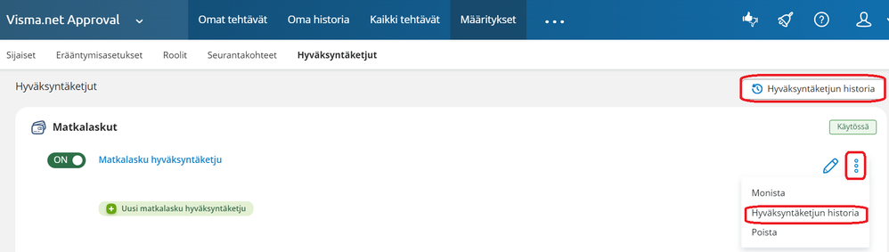 Uuden toiminnon avulla näet jatkossa Expensen laskujen hyväksyntäketjuun tehdyt muutokset. Mikäli Approvalissa hyväksytään myös yrityksenne ostolaskuja, koskee muutoshistoria myös ko. ketjuja.